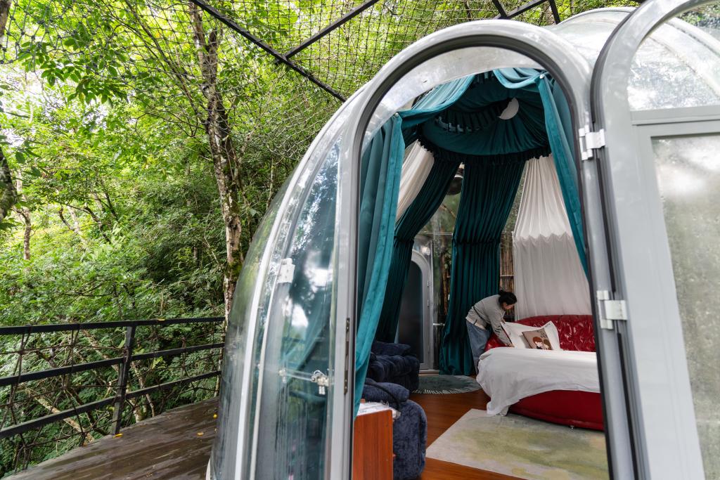 8月27日,工作人员在广南县六郎城村“六郎城·仙草秘境”景区内整理民宿房间。