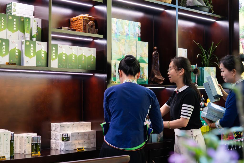 8月27日,游客在广南县六郎城村了解一款添加铁皮石斛的护肤品。