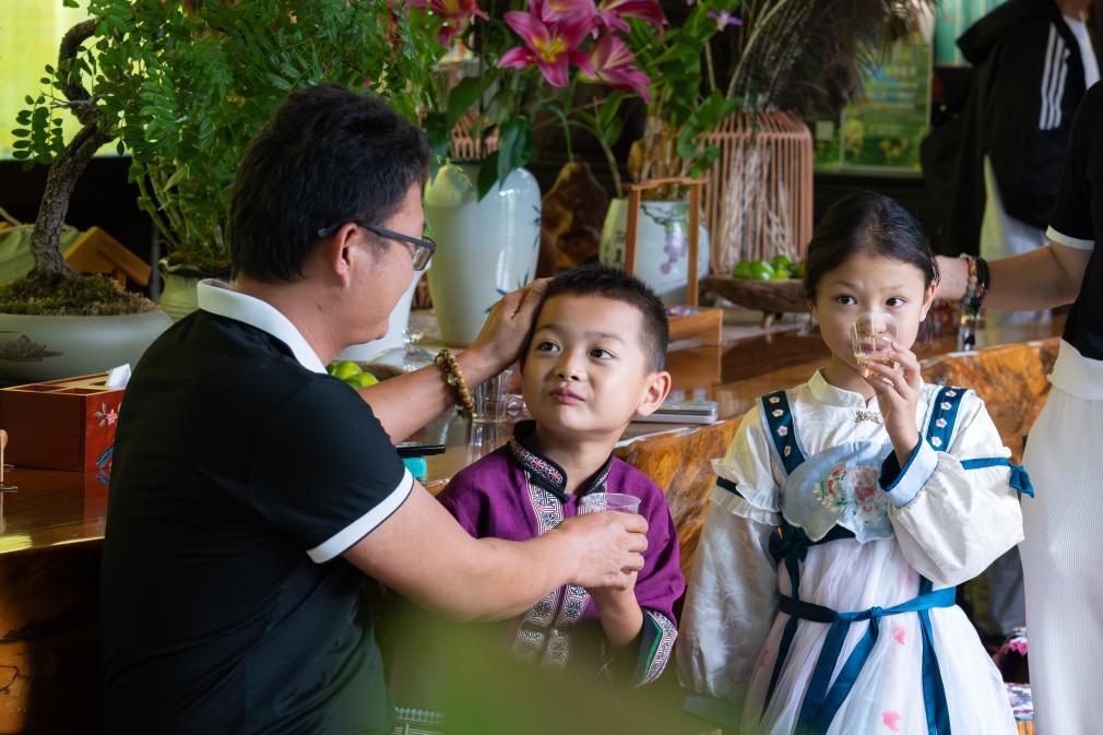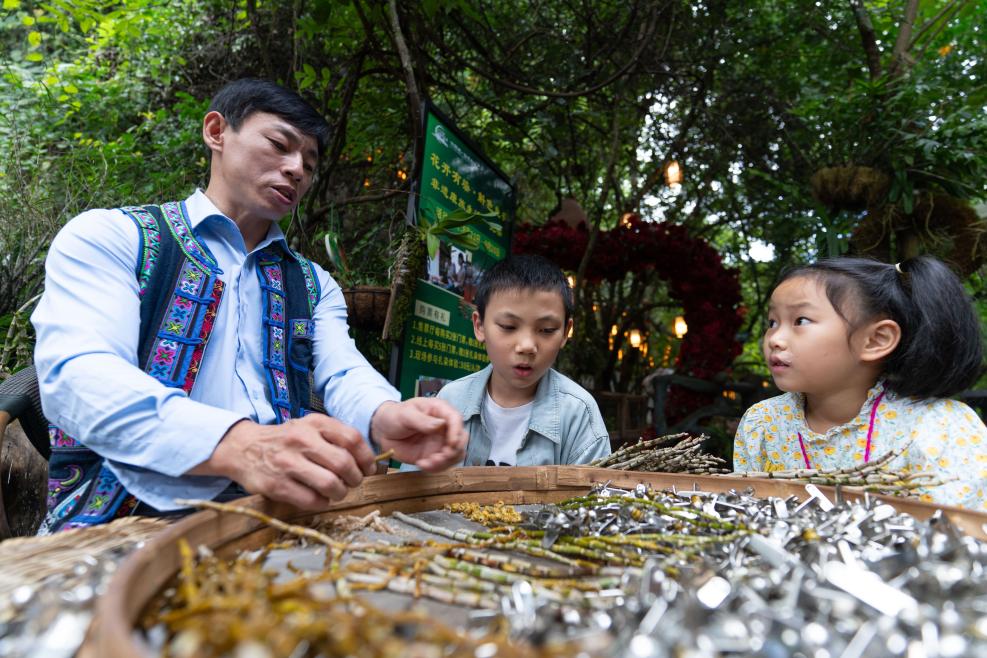 8月28日,游客小朋友在广南县六郎城村了解利用铁皮石斛制作西枫斗的技艺。