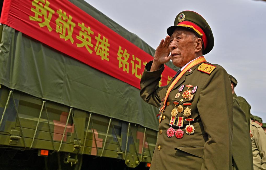 9月12日,志愿军老战士在沈阳抗美援朝烈士陵园门口迎接运送志愿军烈士遗骸的车队。新华社记者 周华 摄