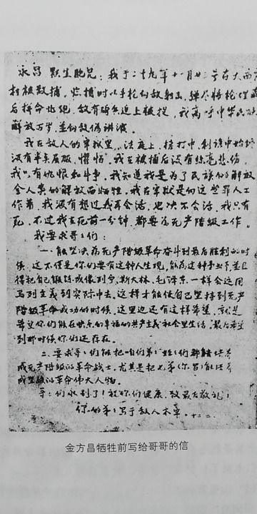 “我在敌人的牢狱里、法庭上、拷打中、利诱中始终没有半点屈服、惧怕。我在被捕后没有丝毫悲伤,我只有仇恨和斗争。我知道我是为了民族的解放、全人类的解放而牺牲。”金方昌在绝笔信中希望哥哥们能坚决为无产阶级革命奋斗到最后胜利的时候,也希望他们把弟弟、侄子们都培养成无产阶级的革命战士。