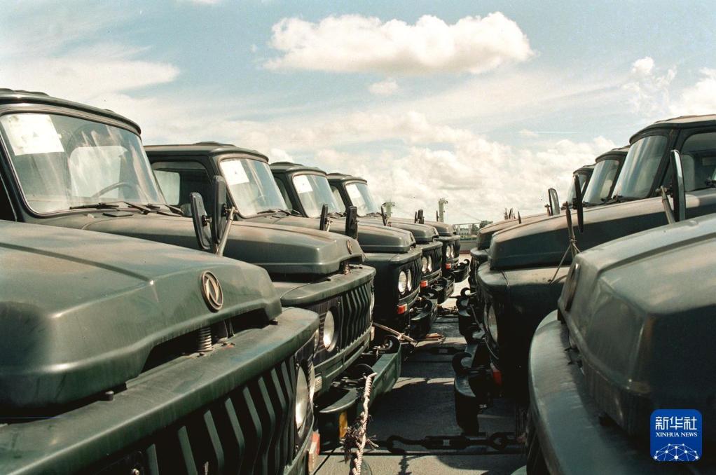 1993年10月,一批中国东风6吨半载重汽车运抵缅甸仰光港。新华社记者 陈炳其 摄