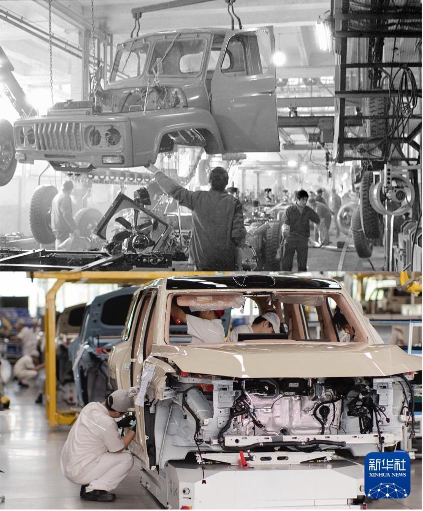 拼版照片:1984年,第二汽车制造厂汽车总装生产线上,工人正在组装一辆EQ140(上图,新华社记者 花皑 摄);2025年9月9日,工人在东风猛士科技园生产线上组装猛士M817(下图,李晓笛摄)。