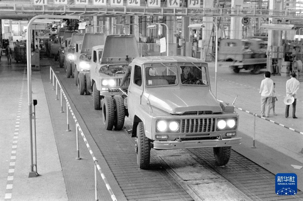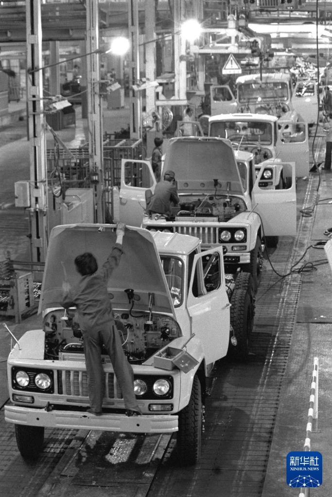 1982年,EQ140在二汽装配厂的总装车间等待下线。新华社记者 刘心宁 摄