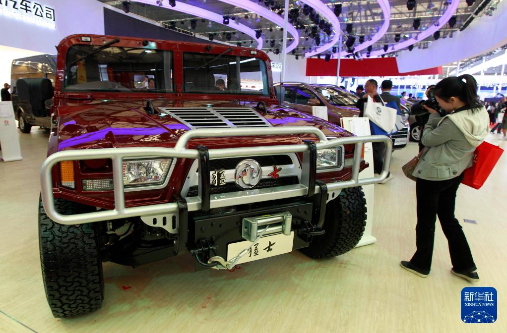 2011年4月19日,观众在第十四届上海国际车展参观东风汽车推出的猛士越野车。新华社发