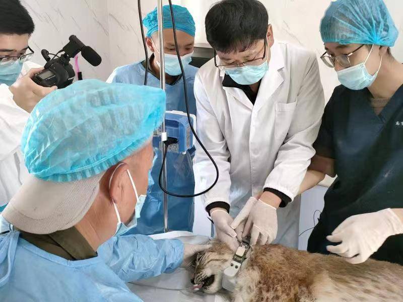 这是工作人员在救护放归猞猁“天线宝宝”。新华社发
