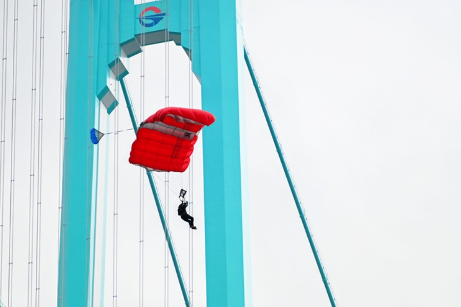 桥面上,荷兰低空跳伞运动员、本届赛事安全员卡姆正忙于最后筹备,监测风速、风向。这位拥有13年低空跳伞经验的专家,同时身兼特技演员与赛事组织者,曾获得荷兰全国翼装跳伞锦标赛季军。尽管今年天公不作美,他表示“全球顶尖运动员皆以来到这里为荣”。