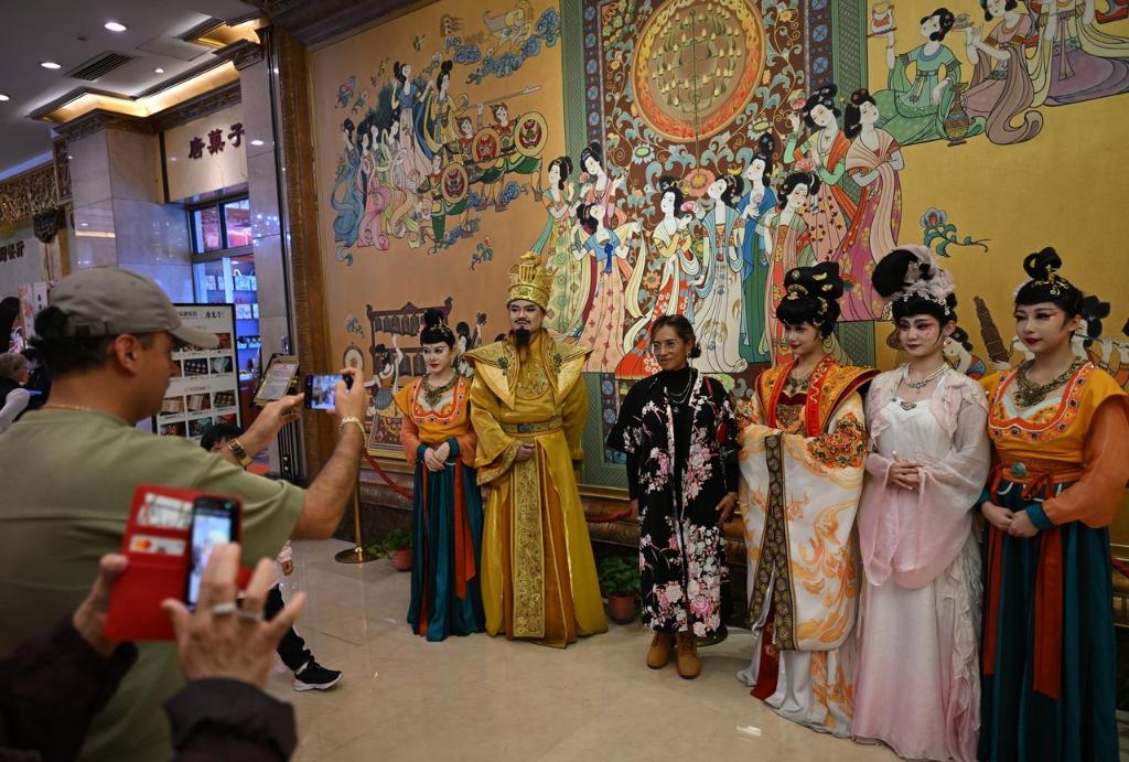 10月4日,在西安唐乐宫,墨西哥游客在观看完演出后与演员合影。新华社记者 李一博 摄