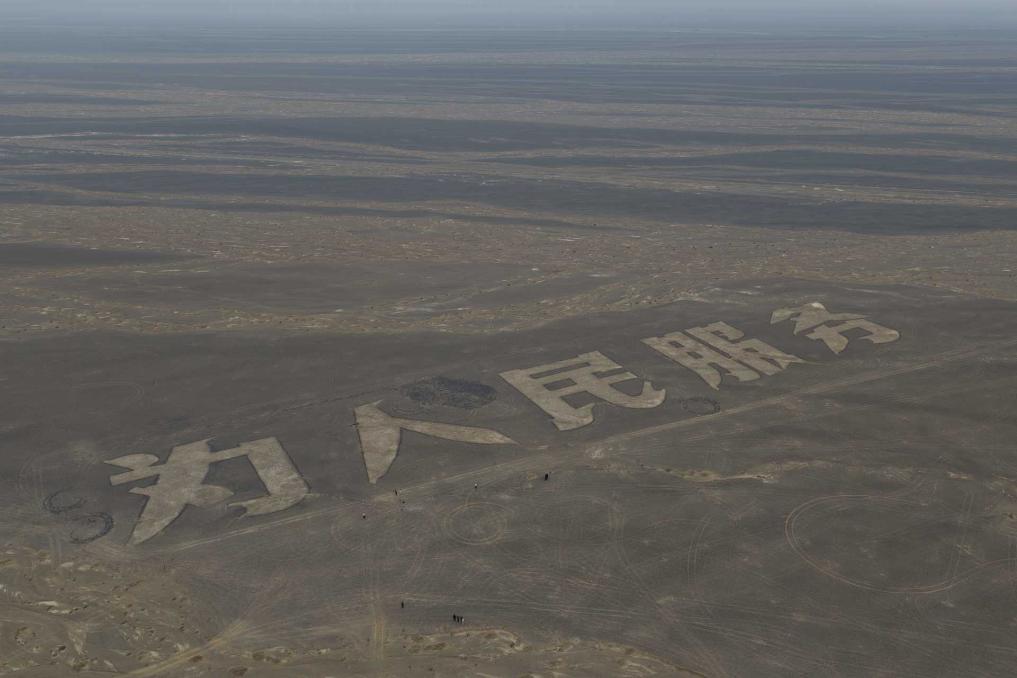 11月6日,新疆哈密市伊州区沁城乡戈壁滩上的“为人民服务”巨幅飞行地标(无人机照片)。新华社记者 张啸诚 摄