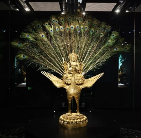图为展厅里的明宣德铜鎏金孔雀明王像。新华社发