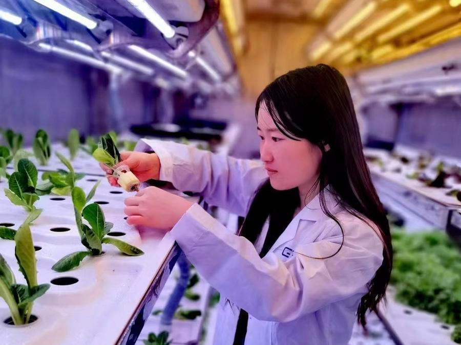 在集装箱植物工厂内部,工作人员正在查看蔬菜长势。新华社发