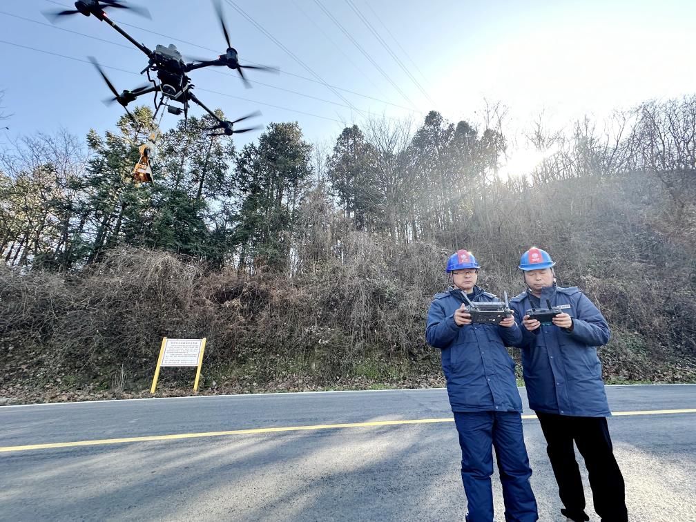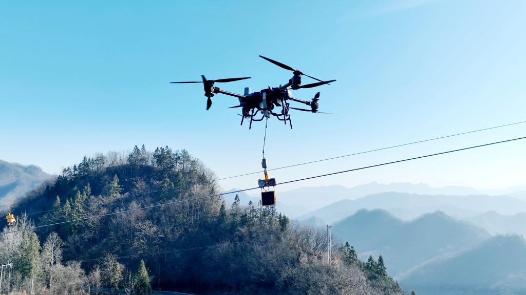 无人机在带电线路上安装防冰机器人。新华社发(吴映宏 摄)