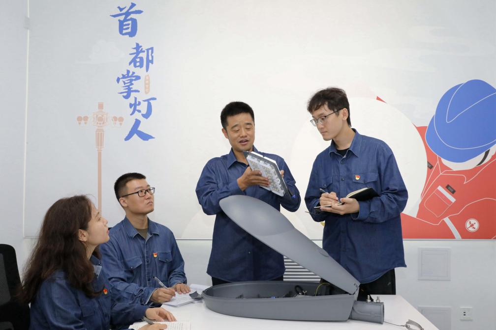在国网北京电力城市照明管理中心的陈春光创新工作室中,华灯班班长陈春光(右二)正在为青年职工讲解模组化LED路灯的专业知识。新华社发(张超摄)