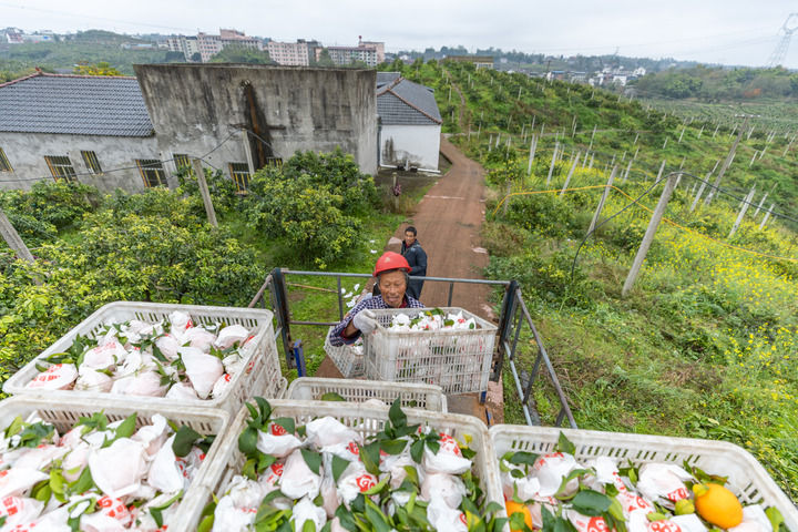 在重庆市忠县新立镇双柏村,村民将新鲜采摘的爱媛橙装车。