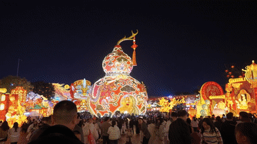 从青花瓷器、玻璃药瓶到两千斤稻草……“万物皆可成灯”的巧思令人赞叹。“年年招财”“木兰传奇”等创意灯组,让老民俗焕发新生机,也吸引着越来越多年轻游客。