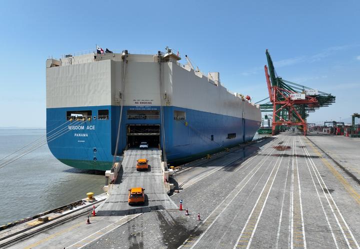 上汽集团乘用车福建宁德基地生产的车辆从福州港江阴港区驶上远洋滚装轮。新华社记者林善传摄