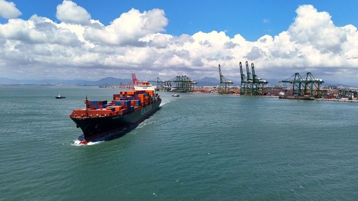 眼下,来到福清江阴港,但见桥吊运转、车辆穿梭、巨轮破浪,集装箱如积木般整齐排列,现代化泊位连点成线,一派欣欣向荣的繁忙景象。
