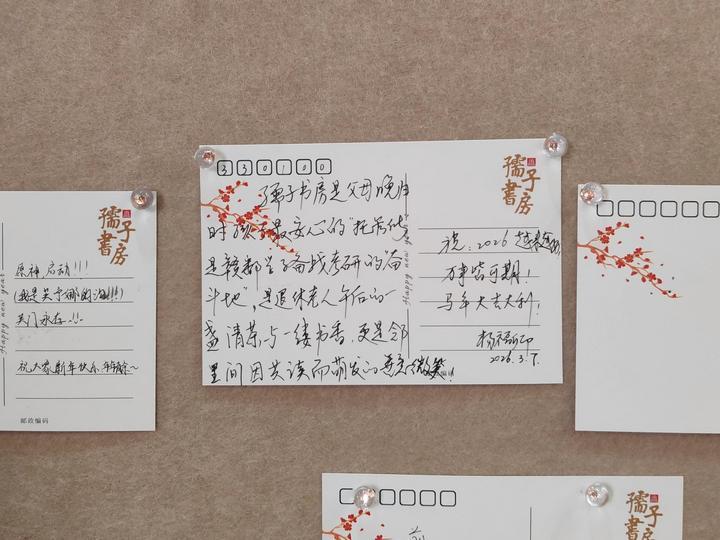 软木板上,还钉着另外20来张明信片,字迹或稚嫩或飘逸。有人祝自己活出不同人生,有人祝所有人都有面对命运挑战的勇气,有人许愿中考高考顺利,有好友互道祝福、彼此鼓励,也有一些话写给书房:“祝孺子书房越做越大,越办越好!”“孺子书房,我将永远追随你!”