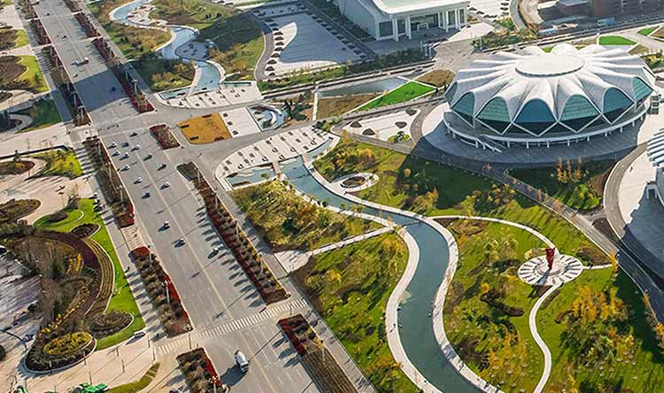 迁安市人民广场是冀东面积最大、设施最完善、功能最齐全的广场,广场东西轴线以水为题,连续5座音乐喷泉及叠水、涌泉、小溪,水流由高向低,从外向内,奔腾流向中心的下沉式汇聚广场,寓"汇四方财富,聚八方宾朋"之意,彰显迁安山水相映、刚柔相济的北方山水城市特色。