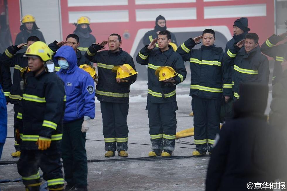 1月3日,哈尔滨仓库大火已经持续了20个小时,挖掘机正在现场搜救遇难消防员遗体。哈尔滨北方南勋陶瓷大市场仓库大火,目前已经造成了5名消防战士牺牲,14人受伤,549户2000多名居民以及部分的临街商户受灾。图为一具消防战士遗体被找到,战友集体敬礼送行。京华时报摄影记者 谭青 摄