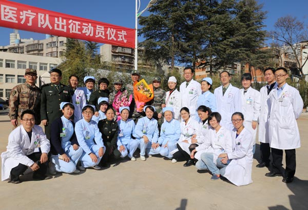 1月6日上午,解放军成都军区昆明总医院援非医疗队赴利比里亚抗击埃博拉疫情出征仪式在昆明举行。成都军区昆明总医院政委黄国林介绍,医疗队除抗击埃博拉疫情外,还将对当地医护人员进行医疗卫生防疫和医学培训。(邱丽芳摄影报道)