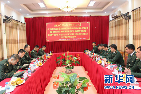 近日,广西边防总队龙邦边检站代表团一行6人应邀出境与越南茶岭口岸边防屯开展2014年第四季度定期会谈会晤。