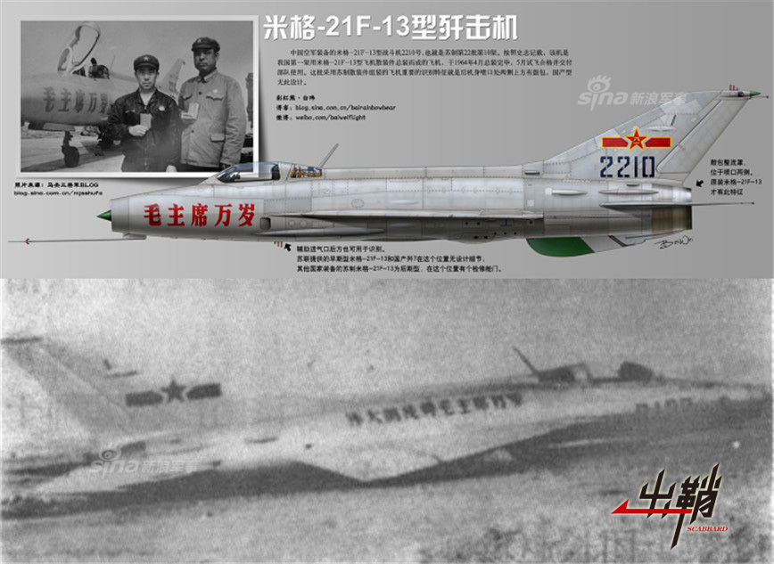 而在更先进的歼-7/8战机上也偶有见到这种时代烙印明显的涂装。上图为沈飞早期组装的米格-21F-13,四位数生产批次编号移到垂尾,机头有“毛主席万岁”字样。图为1968年空3师歼-7战机首次迫降成功后拍摄,机身上“伟大的统帅毛主席万岁”字体明显,但相对歼-5/6已经简化不少。