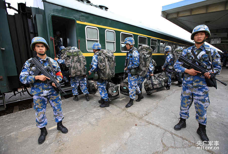 1月9日下午,海军陆战队寒训第三梯队从广东整装出发,长途机动4000余公里赴东北某训练基地开展寒区训练。图为海军陆战队某旅组织装载及出发的场景。周启青摄
