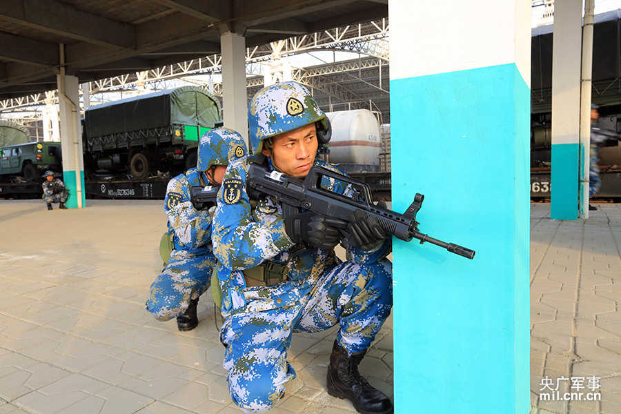 “列车后方发现不明武装分子……”1月12日下午,海军陆战队某旅寒训专列临时停靠鲁西某车站,应急分队立即启动反“敌”袭扰应急预案,果断处置特情。机动途中,该旅坚持一路走、一路练,随机设置敌机侦察、敌炮火拦阻、小股敌人袭扰等多种突发情况,锤炼官兵应急处突能力。周启青摄