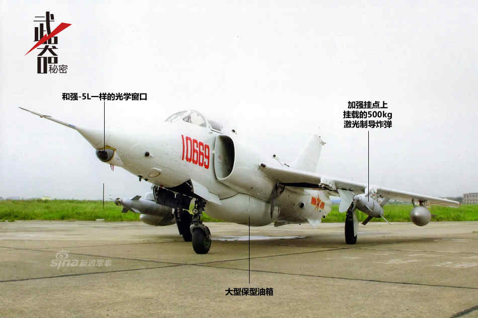 另外还有一种增装了保形油箱的强-5G型,该机主要解决投放制导炸弹时由于只能挂载小副油箱而作战半径偏小的问题;这种保形油箱在巴基斯坦改造其歼-6战机时就有应用。但也使得机腹的4个挂点被取消,但由于这种改进型主要用于投放雷霆激光制导炸弹,因此少了4个挂点不是多大的事儿。