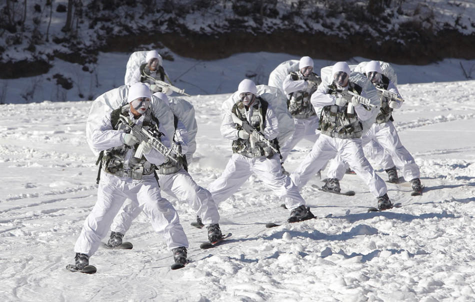 2015年1月8日,韩国平昌郡,韩国陆军特战司令部士兵参加冬季军事演习,在零下20摄氏度气温下进行实战背景下的长途奔袭,演练反击来自朝鲜方面任何可能的进攻。