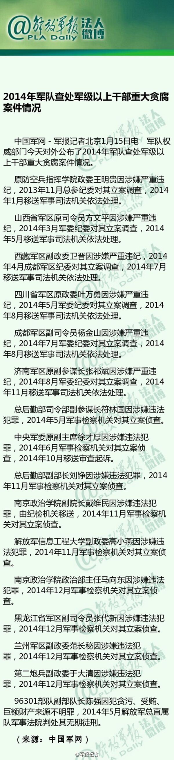 昨日,解放军权威部门公布了2014年16起军级以上干部重大贪腐案件。根据解放军报官方网站中国军网介绍,这些落马的军队高级将领来自中央军委、四总部(总后勤部)、四大军种(二炮)、七大军区(成都军区、兰州军区、济南军区)、省军区(黑龙江省军区、四川省军区、山西省军区、西藏军区)、军事院校(南京政治学院、解放军信息工程大学)以及96301部队。由于原总后勤部副部长谷俊山是十八大之前已被调查,所以并不在这一名单之列。