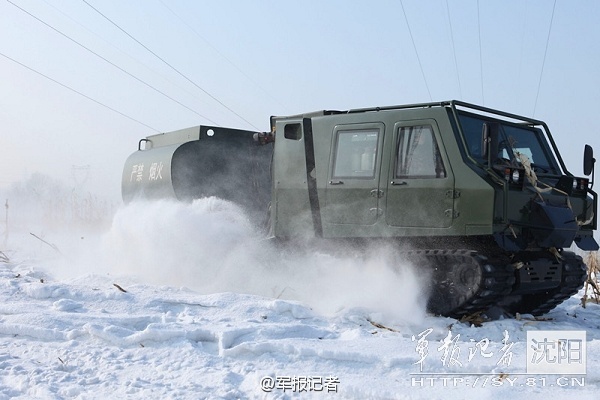 军报官方微博:1月13日上午,沈阳军区某综合仓库一场油料保障演练中,新配发的全地形履带式加油车首次亮相。全地形履带式加油车可在涉水路、弹坑路等路段行驶,为坦克、装甲车、自行火炮、运输牵引车辆等地面装备实施油料保障,极大改变了油料补给受地域条件限制的模式。