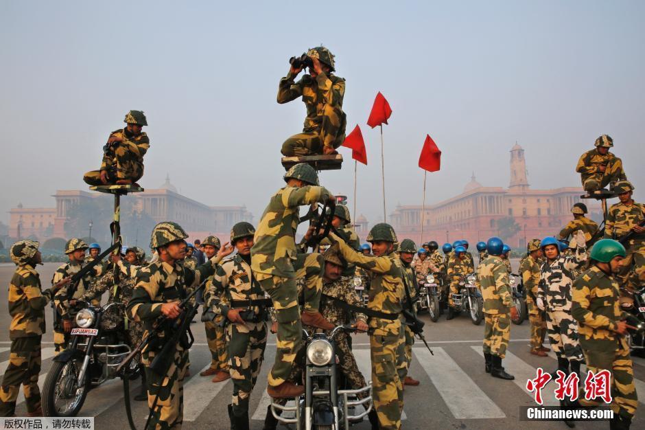 组图:印度士兵为共和国日彩排摩托车叠罗汉