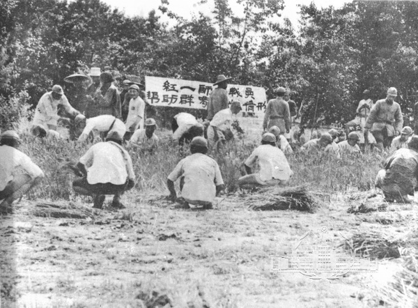 拍摄于东征战役。反映的是红军战士利用战斗空隙帮助晋西驻地群众收割小麦的情景,展现了红军一心一意为人民,处处关心爱护人民群众的光荣传统和优良作风。在画面中心“红一师指战员帮助群众麦收情形”的大标语,使作品的主题鲜明,增强了宣传力量。