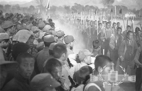 1938年1月,晋察冀边区政府成立后,立即颁布了成立人民武装自卫队的组织条例,画面是阜平民兵自卫队进行军事操练和接受人民武装总指挥部检阅时的情景。步伐矫健,烟尘飞扬,雄壮的民兵队伍勇往直前,充满高亢热烈的气氛,展现了人民武装的强大力量。1995年,《解放军画报》以两版跨页大篇幅刊发这张名作。