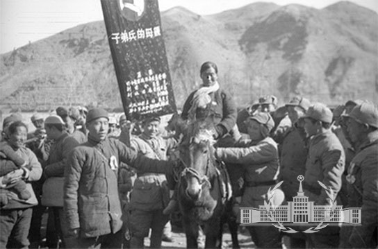 1944年春节期间,晋察冀边区召开空前盛大的群英大会,各行各业、各条战线上的英雄模范济济一堂,认真总结、交流经验,并召开万人大会,给英模颁奖。在群英大会闭幕、各地英模纷纷返回时,作者不失时机地抓拍了军区政治部主任朱良才送别子弟兵母亲戎冠秀这幅生动的画面。戎冠秀是河北平山县下潘松村一位普通农村妇女共产党员。她在残酷的反“扫荡”激烈炮火中,抢救过几十名八路军伤病员。一次,她从雪地里把—名负重伤的战士,爬山过岭背回家,在医药和粮食极端不足的情况下,她以无微不至的母爱精心照料、千方百计用土办法把伤员治好,使其重返前线。因此,荣获晋察冀军区授予的“子弟兵的母亲”光荣称号。这幅作品深刻地反映出“人民是哺育我们成长的母亲”这一伟大真理。