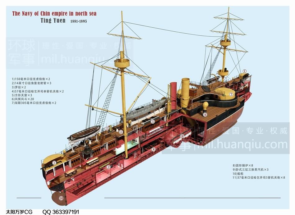 近日,有网友用电脑绘图技术还原了北洋水师定远舰的真实面貌,并绘制了该舰了多角度透视图,全方位展示这艘历史名舰。(制图:太阳万岁)
