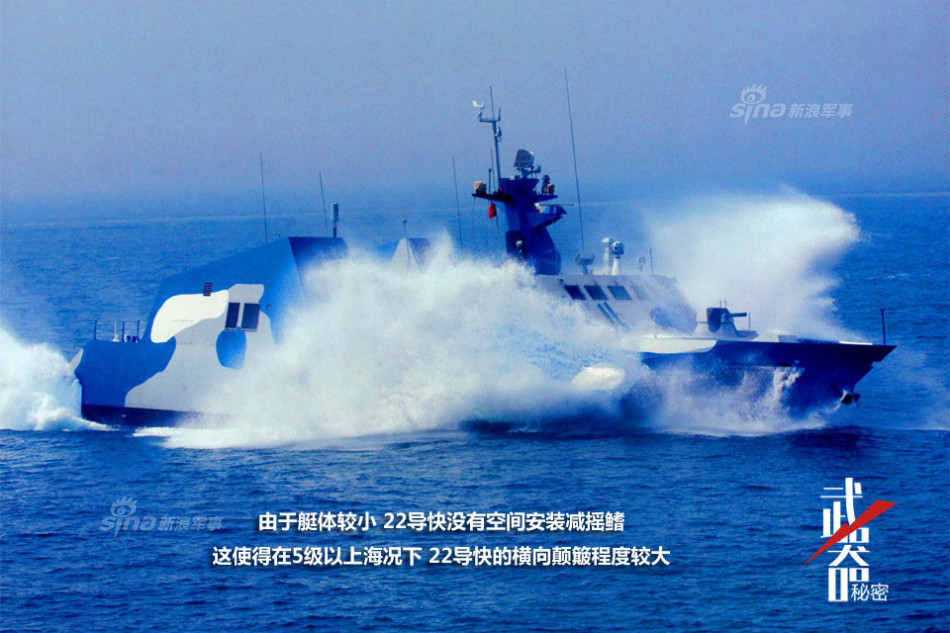 另外由于设计问题,当8枚鹰击-83全部发射之后,全艇重心靠前,埋艏现象严重,虽然可以通过调节压载水的方式解决,但这毕竟需要时间,对撤退不利。而高航速也带来高速航行时的严重颠簸,双体穿浪船型的特性还使得当海况大于某一数值之后,22导快的横摇周期要比单体船更短。