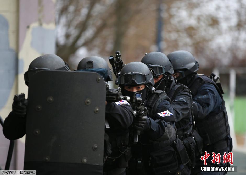 当地时间2015年1月21日,韩国首尔,韩国特种部队士兵和SWAT特警共同参加反恐演习。