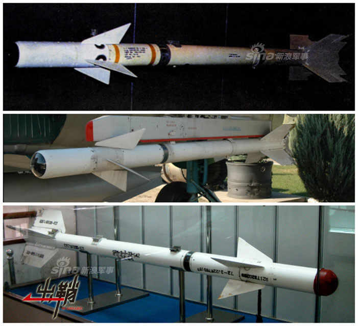 刨除建国前缴获的飞机,我国航空工业最早获得的样品是在1958年海峡空战中,国民党空军F-86发射的AIM-9B(上)未爆炸坠地,基本完整的导弹弹体被我军得到,后来移交给苏联,苏联仿制成K-13(中,北约称之为AA-2“环礁”)之后又随米格-21出口我国,我国仿制型为霹雳-2(下)。
