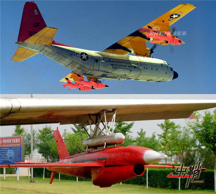 在60-70年代的国土防空作战中,我军还曾用歼-6和歼-7飞机击落数架BQM-34“火蜂”无人侦察机(上,使用C-130作为母机投放),其残骸被我国分析研究,后来成为无侦-5/长虹-1号无人侦察机(下)的仿制母型,早期使用图-4作为母机,后来使用运-8作为母机。