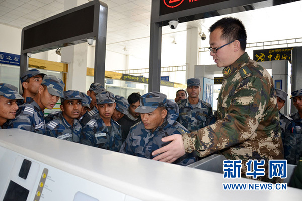 官兵为尼泊尔武警介绍边检通关平台使用方法