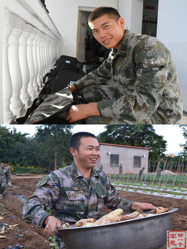新兵欧阳州(下图)挑战同年兵卞尚尚(上图):“你在整理包裹房,我在菜地劳作,多了一份丰收的喜悦,所以我的微笑更灿烂。”