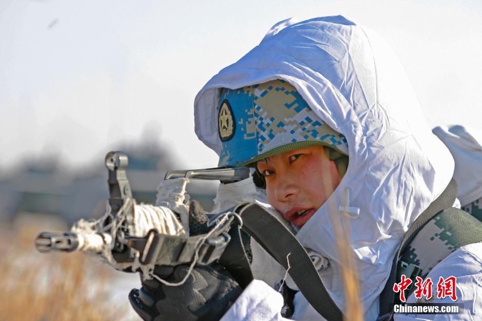 首次赴东北进行寒训的中国海军陆战队,24日在沈阳军区洮南训练基地进行连续跨昼夜综合战术演练。图为女性陆战队员射击准备中。王曦 摄