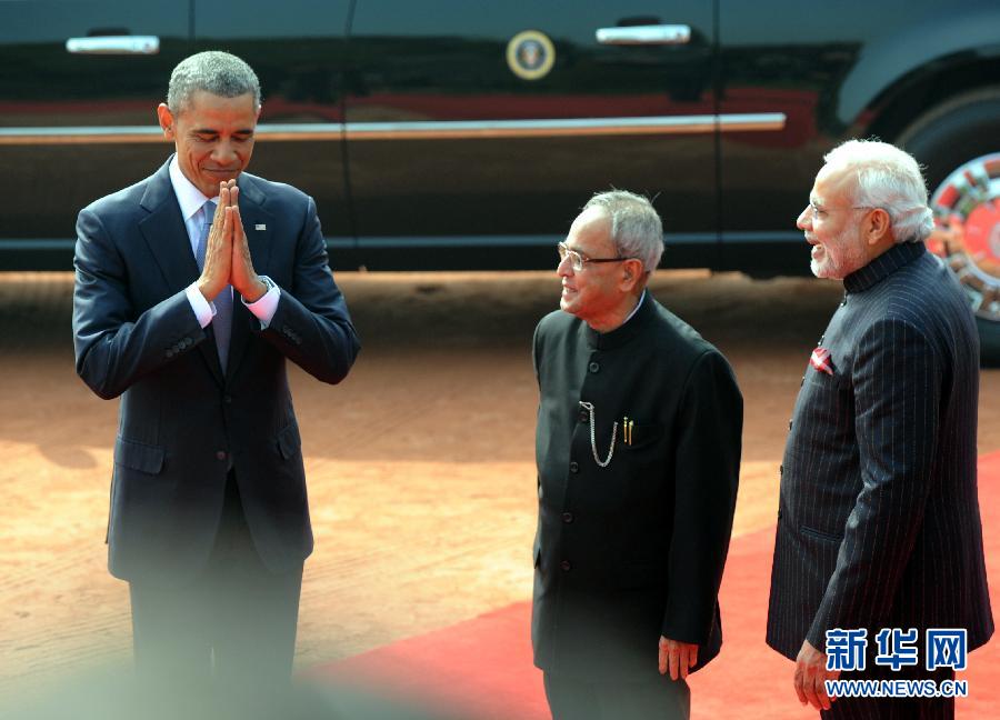 为了迎接美国总统奥巴马的访问,印度从首都新德里到著名景点泰姬陵,美国总统车队将到之处一律开展大扫除,就连徜徉街头的“神牛”“神猴”也要让路。美方特工甚至一度要求印度取消“共和国日”空中阅兵。1月25日,在印度首都新德里,美国总统奥巴马(左一)在欢迎仪式上做出印度传统问候手势。新华社发(帕塔·萨卡尔摄)