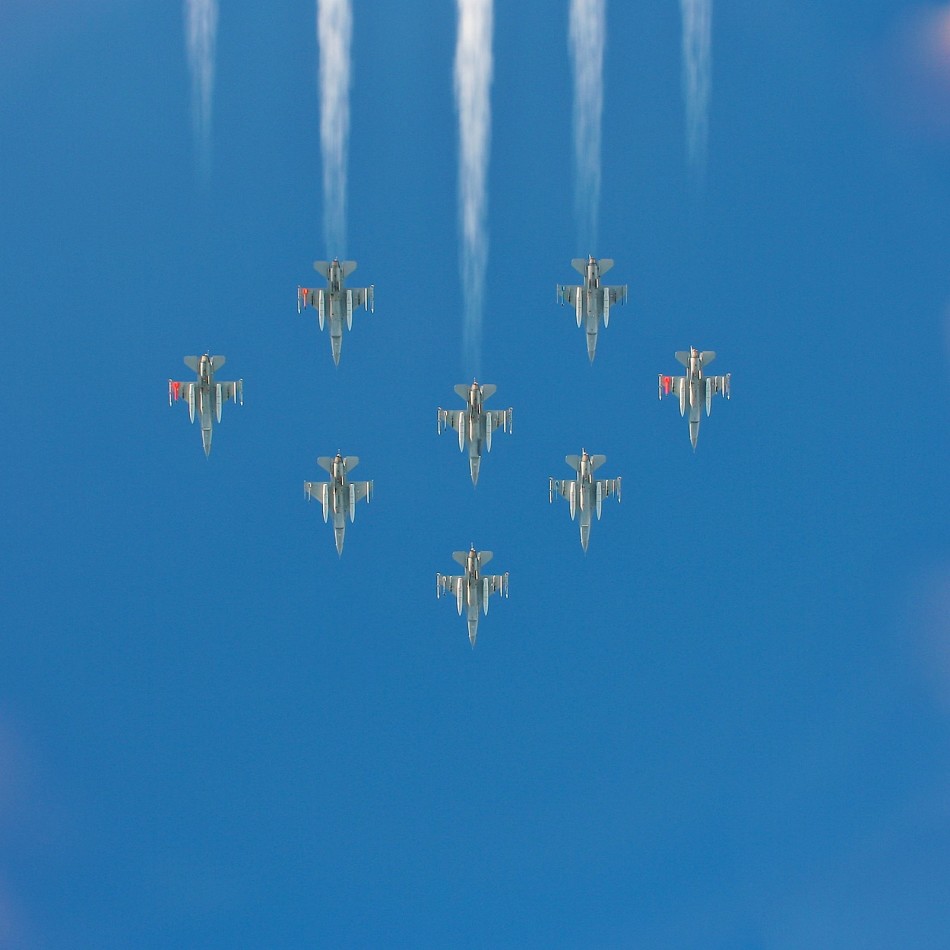 挪威是北欧一个小国家,其总兵力只有约23000人左右。其空军部队人数更少和平时期只有1300多人。不过人虽少但装备精良,主要配备60多架美制F-16战机。图为挪威空军F-16AM/BM战机进行'空中编队走秀'。