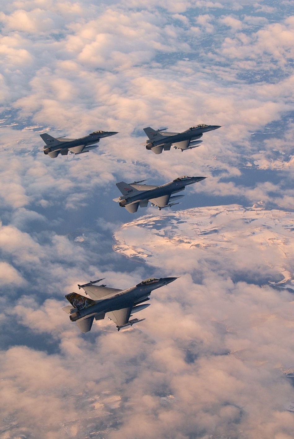 挪威是北欧一个小国家,其总兵力只有约23000人左右。其空军部队人数更少和平时期只有1300多人。不过人虽少但装备精良,主要配备60多架美制F-16战机。图为挪威空军F-16AM/BM战机进行'空中编队走秀'。