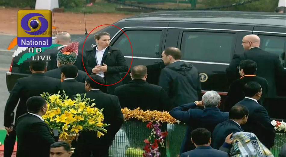 2015年1月26日上午,美国总统奥巴马乘专业抵达印度共和国日阅兵式现场。随车队有许多美国总统保镖在现场护卫。当专车停下时,一名体形彪悍女保镖迅速走到专车前戒备,随后与一名男保镖一起为奥巴马开车门。