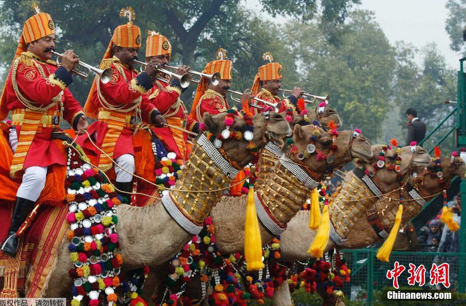 印度边防部队士兵将骑着盛装打扮的骆驼,出现在阅兵仪式上。据了解,印度边防部队是世界上为数不多骑骆驼执行任务的军队之一。